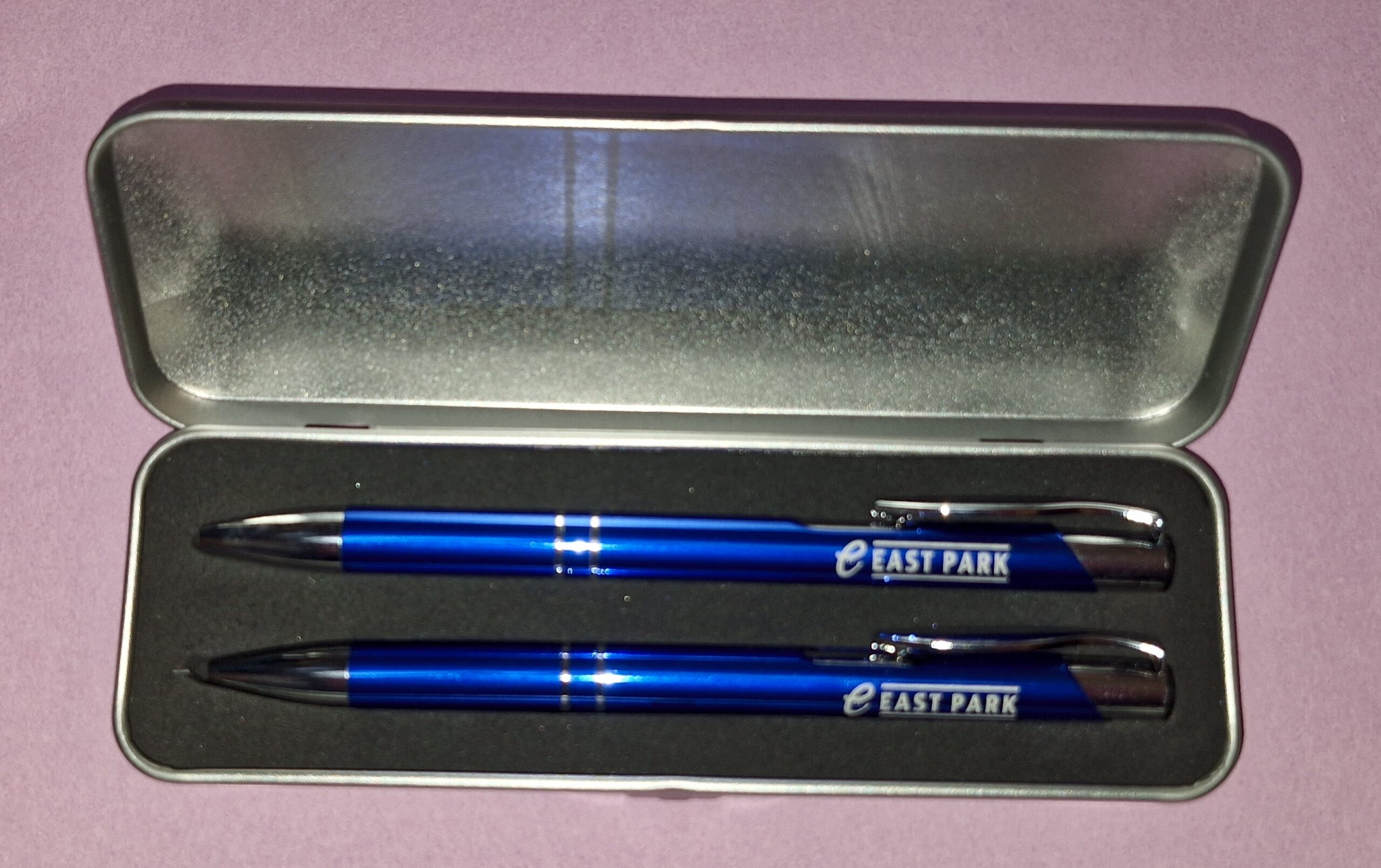 A smart looking pen and pencil set with the East Park logo on them. These come in a metal presentation box.